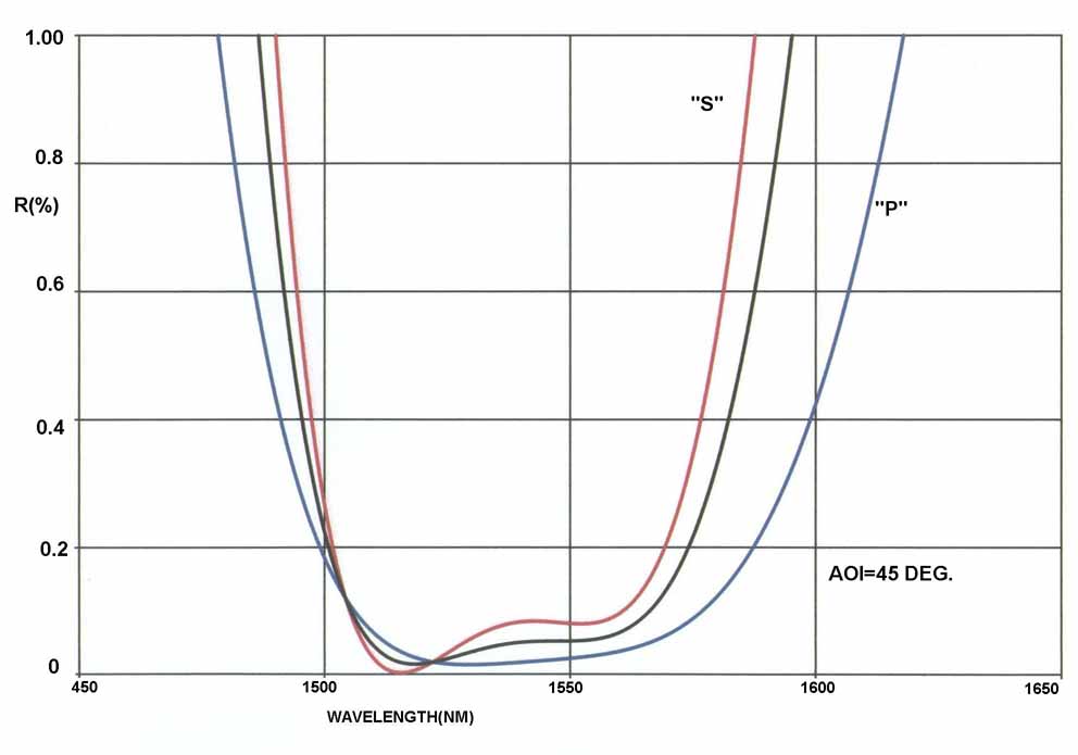 The design performance of the 12 layer AR coating at 45 degrees angle of incidence. The fabricated coating was somewhat narrower in bandwidth and higher in reflectance.